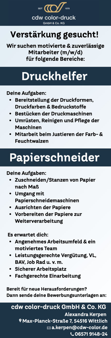 Wir sind immer interessiert an motivierten Mitarbeitern in den Bereichen Kundenberatung, Druckvorstufe, Druck und Weiterverarbeitung.